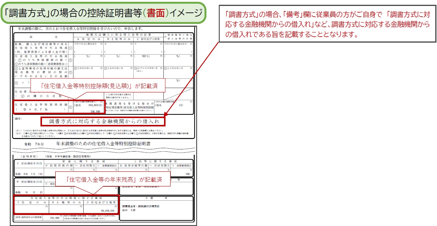 なお、調書方式による適用を受ける従業員は、提出する証明書兼申告書等の備考欄に、「調書方式に対応する金融機関からの借入れ」である旨を記載して提出します。