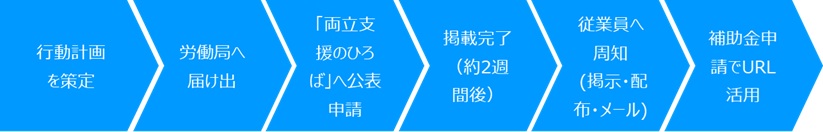 行動計画を策定したら、従業員への周知とともに「両立支援のひろば」で公表します。ものづくり補助金などでは、このサイトでの公表が要件となるため(従業員21名以上)、申請締切時点で有効な計画を掲載しておく必要があります。